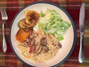 There are many versions of carbonara; this is mine. I make two pans because two of us won’t eat mushrooms.