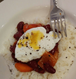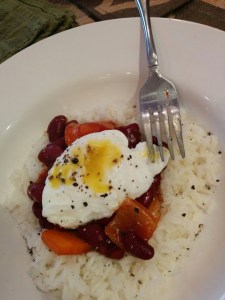 Fry the bacon, onion, celery and carrot together. Add the beans and BBQ sauce and peppers. Cook until the peppers are just cooked. Serve over rice. A poached egg on top is a yummy addition.