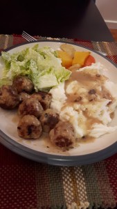 Meatballs, mashed potatoes, roasted veggies and a salad.