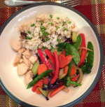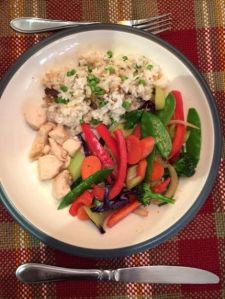 Stir fried chicken and vegetables (onion, pepper, celery, carrot, broccoli, pea pods).