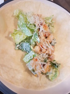 Place some salad in the flat bread, spoon cooked chicken over it, sprinkle on parmesan flakes.