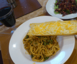 Veggies: Heat peanut oil in the wok. Throw in the carrots first, toss a minute, throw in the broccoli, cauliflower and onion, Toss, then cover a minute. Add the peppers, pour in the sauce, toss and cover a minute.